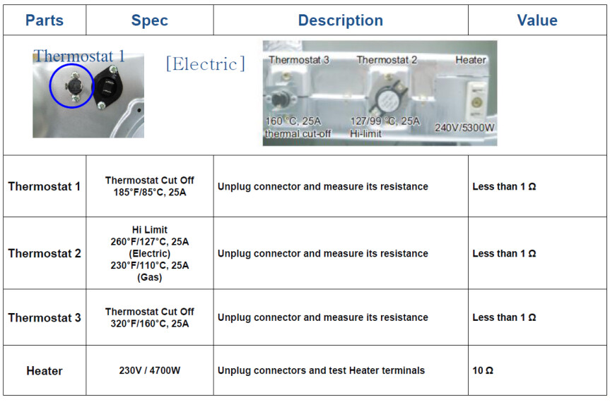 I’d start by checking the continuity of the heating element and thermostats, I’ve attached a little cheat sheet that should help.