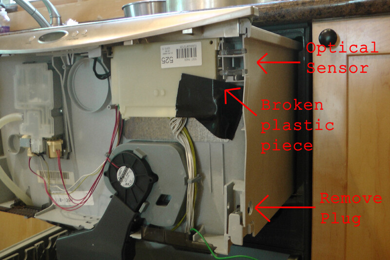 In my case the plastic piece that held the control panel, which is where the optical sensor is, to the inner wall had broken so the optical sensor was misaligned, which is why I was not able to get the dish cycle going. So, I have taped the control panel in (i.e. the black tape) - time will tell if this holds or not.