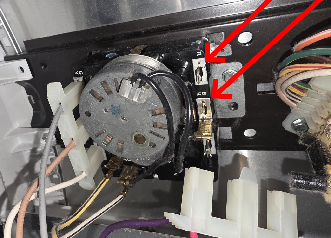 Dryer unplugged. I disconnected the connector as shown to reveal the two terminals (red arrows), and tested multiple times to confirm no, there is not any continuity between terminal BK to terminal R.
