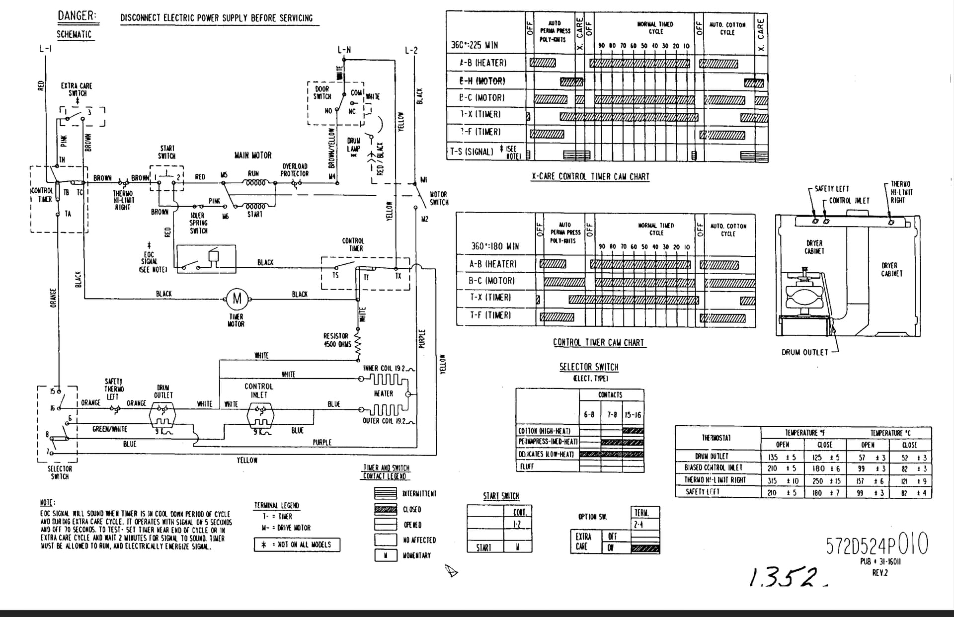 With the voltmeter I found I have 120VAC from the single terminal end of the element to the chassis…I believe that’s normal since the chassis is neutral. But I have no voltage on the element itself, testing from the 2 terminals at the end of the element that has 2 terminals, or from one of those terminals to the single terminal on the other end. I have tested continuity through all the limit switches’ larger terminals and I have continuity there. I have inspected for damage at the terminal block on the motor and I don’t see any damage there. I have tested the resistor behind the control panel, and it’s still measuring ~4500 ohms.
