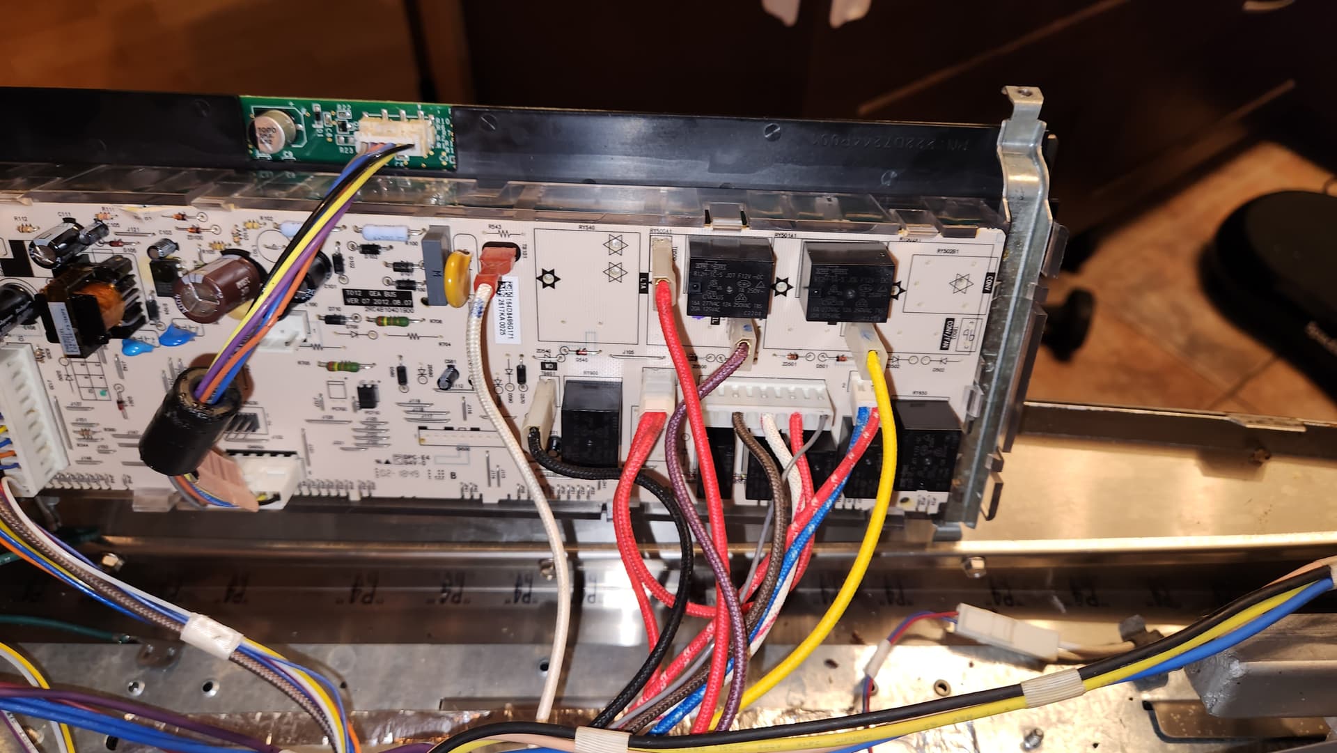 What happens & when: While preheating oven, display suddenly showed random dashes and the oven shut down. I turned off the main breaker for 2 minutes, when I turned the main breaker back on, the control panel is completely dead. Electronic ignition for the range top still works, So the unit does have AC power. All wiring is in good condition. I traced AC power to the control board, and I have 120VAC at L1 and Neutral at the control board. The stove schematic states if the control panel is blank, to check the transformer . . . I can’t find a transformer anywhere on the schematic or on the stove. The only transformer I have found is part of the control board.