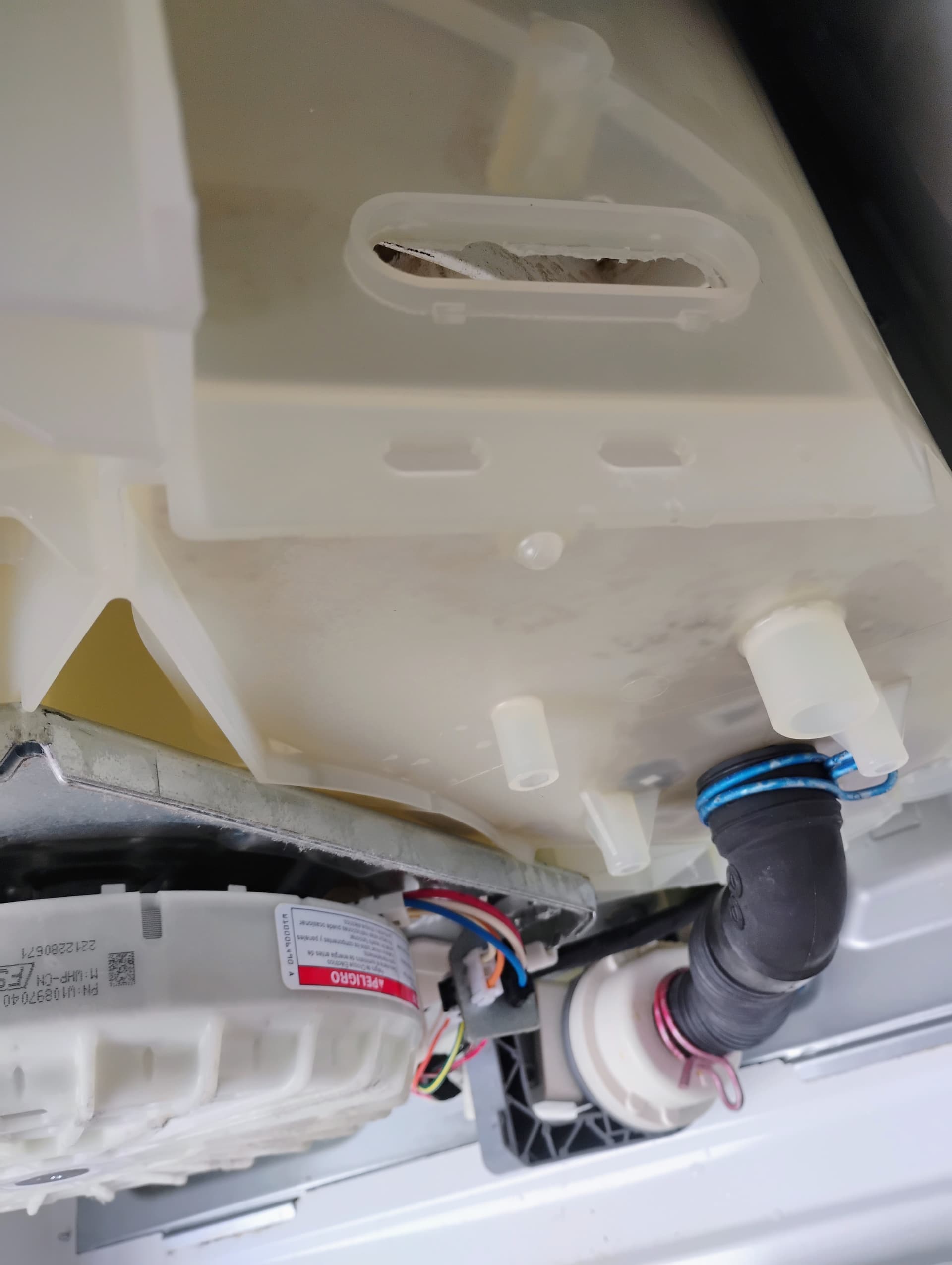 I forgot to add the rest of information… There’s a hole in the side of the tub near lower front corner. It appears that a part should mount there, but no such part is listed in a parts diagram.