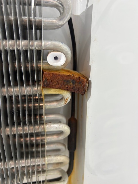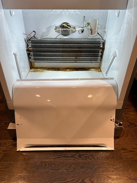 Interior back panel is rusted. The insulator-evaporator pads are discolored from rust and moisture. It seems they are most likely touching the back panel and rusting the panel. I am not sure if there should be moisture on these pads and if they should be touching the back interior panel. This is the second back panel I may be replacing due to this issue. Should I replace these pads? If so are they easy to replace? I cannot find a video or reviews on your website. Also should there be that much moisture behind the panel that is causing all this moisture to collect? There is no signs of moisture inside the refrigerator on the walls, shelves and doors as will any of the contents in the refrigerator. The refrigerator seems to run well as we don’t hear the refrigerator run excessively and the compressor kick on.