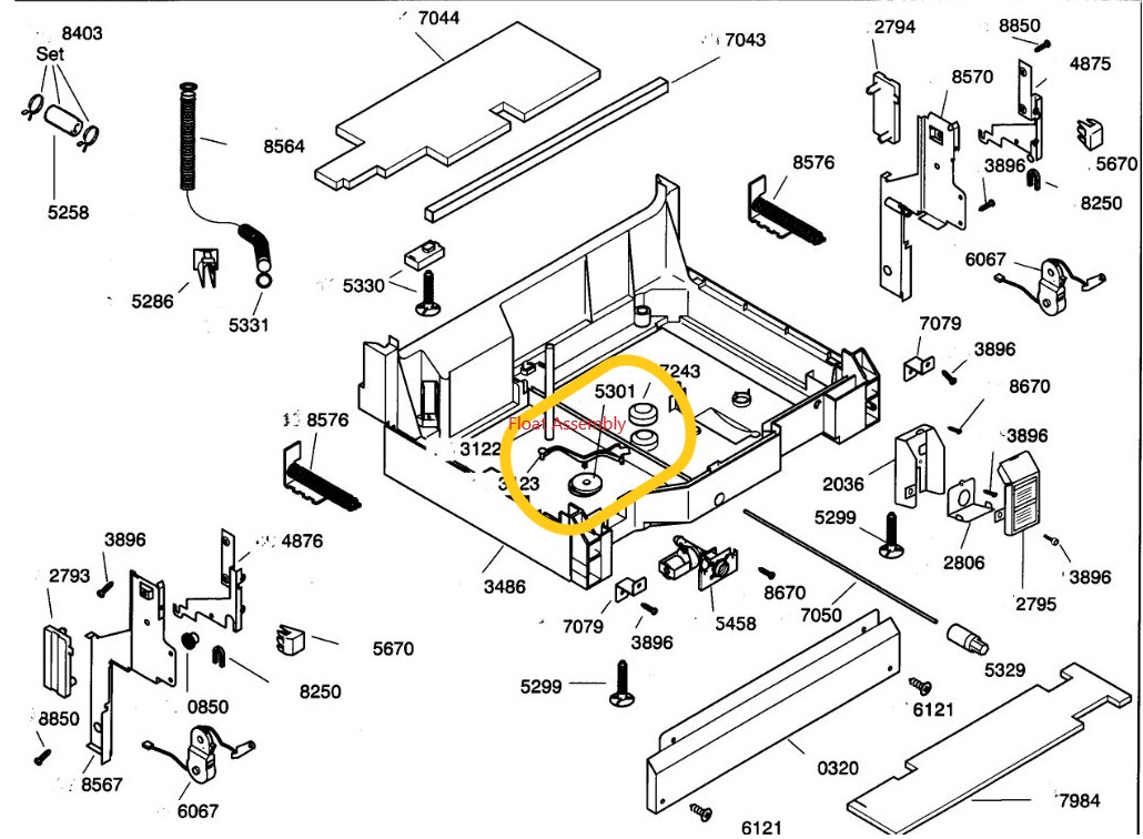 Again you will need to get access to the base of the machine where the float assembly is located and 1. look for a leak or water in the Base (section under the tub where the pump and motor is located. 2. If a leak is found then locate where it is coming from and repair or replace those parts. 3 If no leak or water is found, find the float assembly and check to see if it is stuck or jammed.