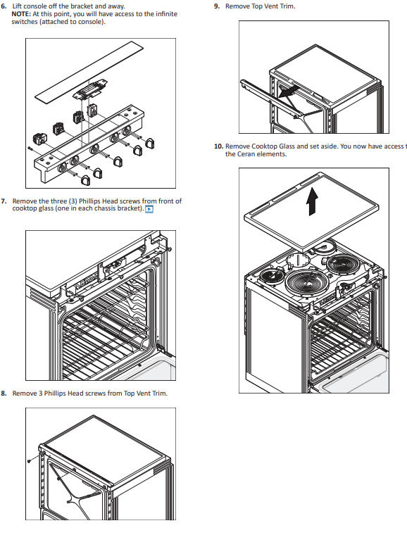 This is a failure with the cooling fan circuit. To test it, the power supply would need to be turned off or the power cord unplugged, the cooktop removed, and the left side panel removed. To do this, remove the center grate and the screws just under it. From there, remove the screws under the console, lift it up, and let it rest on the frame just enough to remove three screws securing the top panel. This image are steps for removing the top panel. Once that is done, the top screws for the side panel can be removed, along with any screws along the back, bottom, or front. The console can be set down back onto the frame where it should sit like normal. The cooling fan should have a purple wire and a white wire going to it. Set the meter to volts AC and place the probes onto the wires as securely as possible. Plug the power cord back in or turn the power supply back on and go into the diagnostic mode to activate the cooling fan test again. Does it get 120 Volts AC?