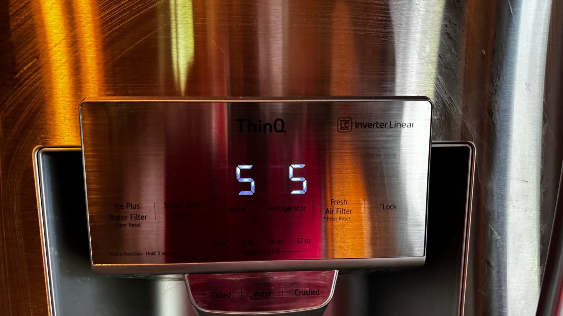 I unplugged the unit (reset?) and cleaned the dust from the coils on the rear, which I do about once or twice a year. I also tried forcing defrost mode by holding the “Freezer” and “Ice Plus” buttons. The display only showed “S S” briefly and then went back to normal.