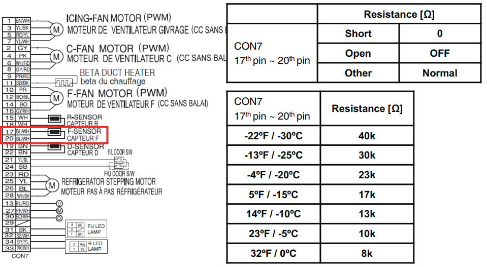 More than likely, the freezer fan is not sending the feedback speed signal to the main control board. These fans can get a DC short and this can cause not just error codes, but it can also cause the main control to not operate properly. However, the fresh food sensor and the freezer sensor can be tested to verify if they are working properly or if there might be something else going on. At the connection CON7 of the main control with the power supply cord unplugged and the CON7 connector disconnected, the fresh food sensor can be tested using the white wires at pins 15 and 18. The freezer sensor can be tested using the blue wires with white stripes at pins 17 and 20. What resistances do you find there? Here is the connector layout from what I am able to see.