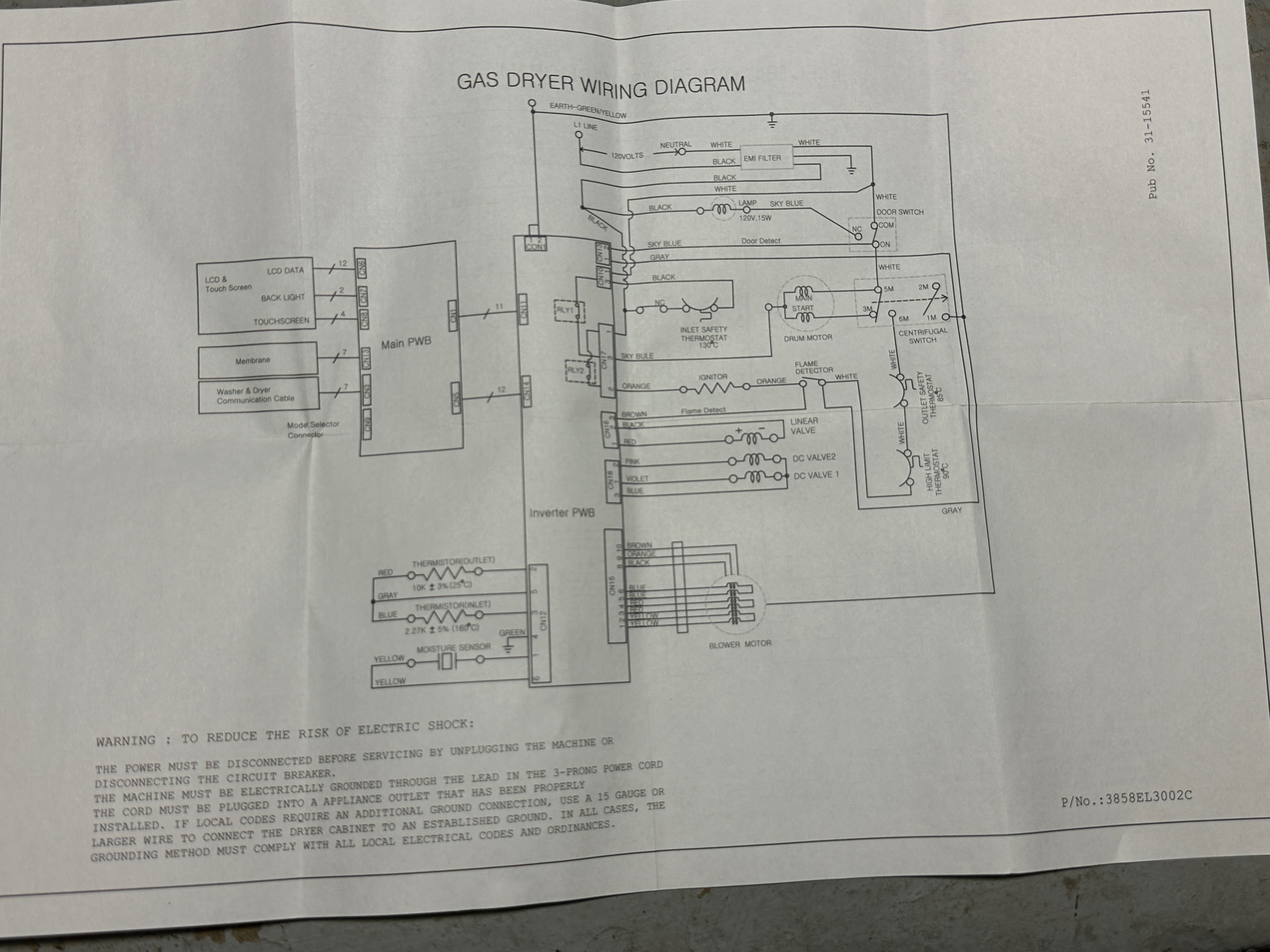 What happens & when: First it made an unusual noise. Then the power went dead. Took apart. I found a broken belt and frozen roller when I took it apart, but don’t think that would cause this problem. Fuse on control board is OK. Looks like it might be the INLET SAFETY THERMOSTAT -130ºC on the diagram but I am not sure which part number that is.