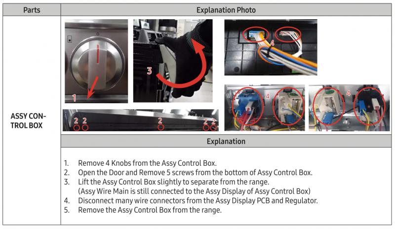 With the power cord unplugged or the breaker turned off, and the knobs removed, there are three screws under the front panel that will need to be removed. Once they are removed, rotate the bottom of the front panel out then lift it up. This will give access to the wires behind the front panel.