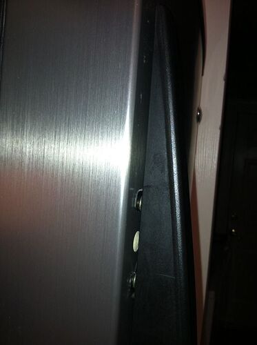 The door handle on the refrigerator half of my Whirlpool Gold Conquest fridge is loose. You can see the gap in the picture. There seems to be some type of connector between the door and the handle, and the connector is securely attached to the door. So somehow, the handle has come loose from the connector and I can’t figure out how to get it back on. Any thoughts?