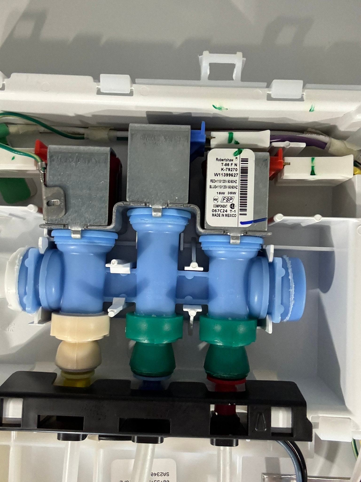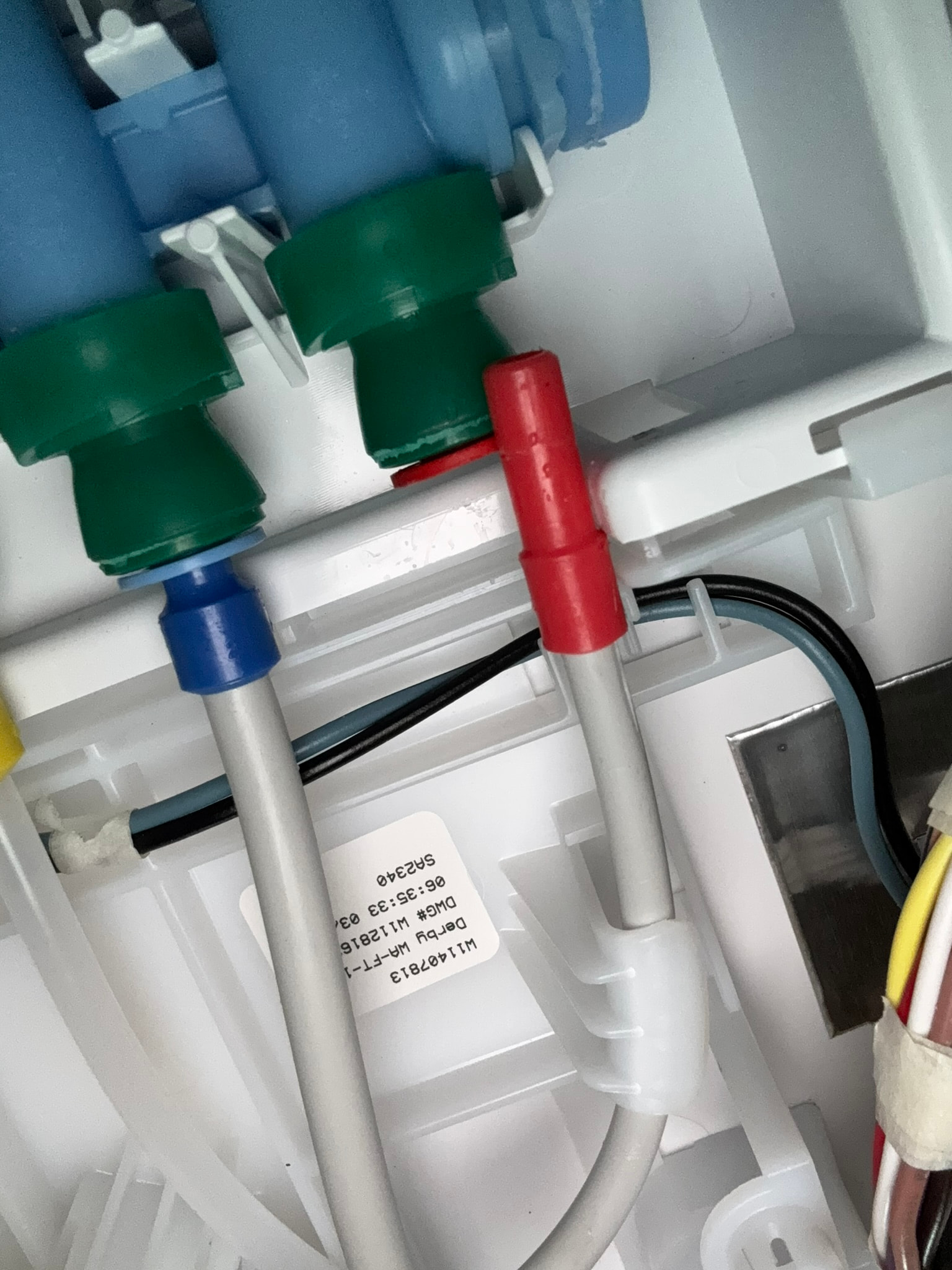 The red valve (one of three) on this water inlet valve W11399627 located at the top of the fridge is dripping when the solenoid is activated. This line apparently feeds the bottom ice maker. POOR Quality Control at Whirpool. I had to have a tech come out under warranty to properly plug in the water supply feed line shown on the left of the first photo. Was my unit manufactured on a Friday at 4:45 pm? LOL/SMH