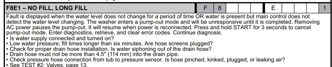 Thanks for the reply. I’m getting an F8E1 error Code, “No fill, Long fill”. I do notice an issue where you hear the water fill at extremely low pressure, as if something were restricting the water…but then it suddenly starts flowing fine again. This also only happens with cold water, which explains why the towels will complete a load when using Hot water. Confirmed no obstructions. Water flows freely. What are your thoughts?