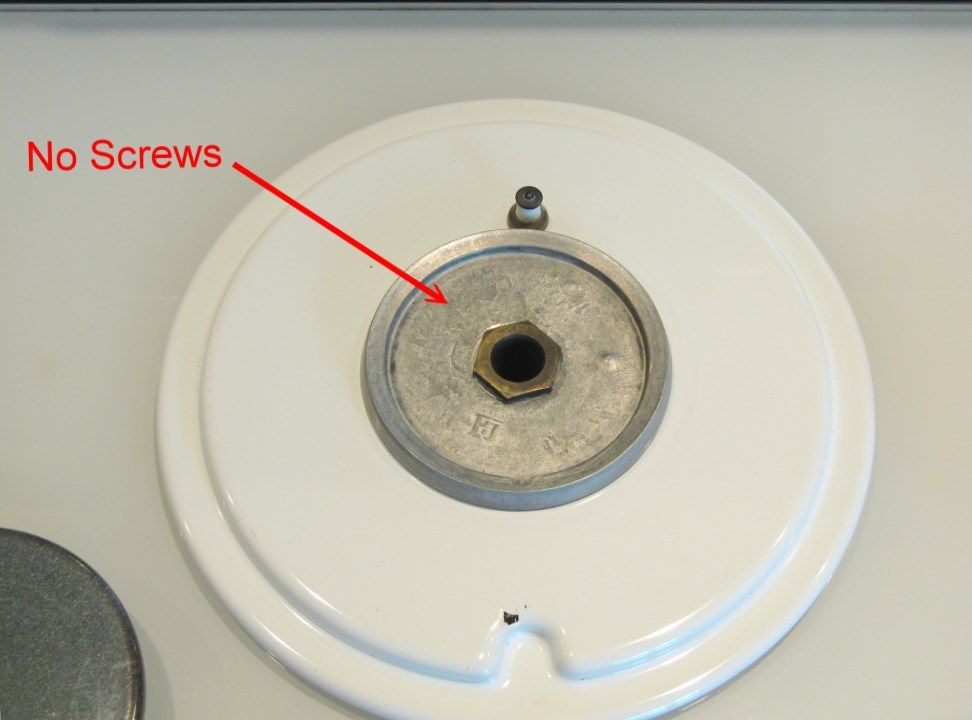 Question #2: How to I remove this cooktop for service? Other posts in this forum describe removing the screws under the burner cap, but my cooktop does not have those screws (see picture below). Instead, it only has a brass nut in the center. Here is what that looks like: